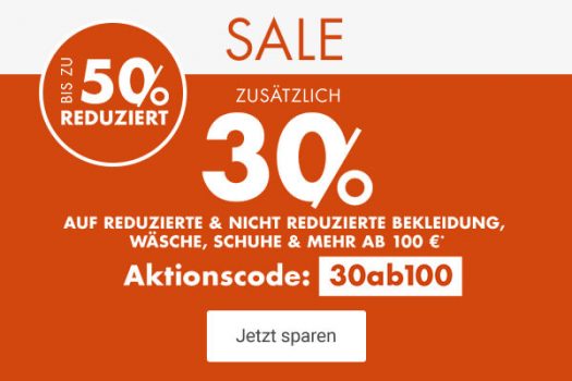 Bis zum 10.01.2020 30 % auf Damen-, Herren-, Kinderbekleidung, Wäsche, Schuhe, Strümpfe und textile Accessoires ab einem Einkaufswert von 100 € sichern. Einfach im Warenkorb den Aktionscode 30ab100 eingeben und der Nachlass wird abgezogen. Gültig auf GALERIA.de für Produkte ausgewiesen mit „verkauft durch GALERIA“. Nicht nachträglich für bereits gekaufte Ware und nicht in Verbindung mit anderen Rabattaktionen und Aktionscodes einsetzbar. Kein Nachlass auf folgende Marken: galeria.de/prozent-ausschluss.